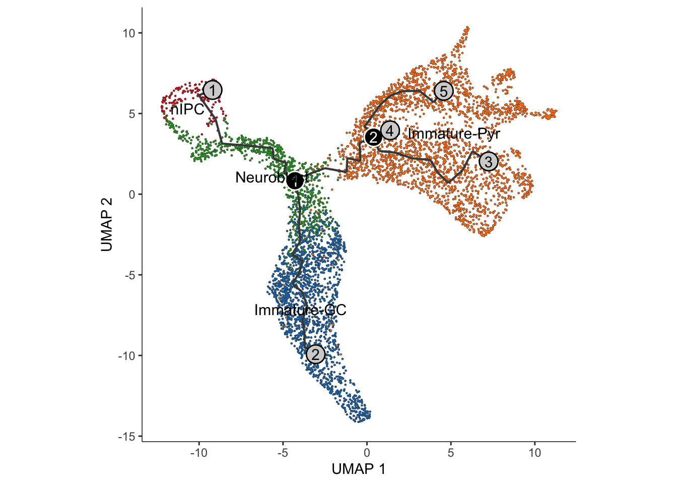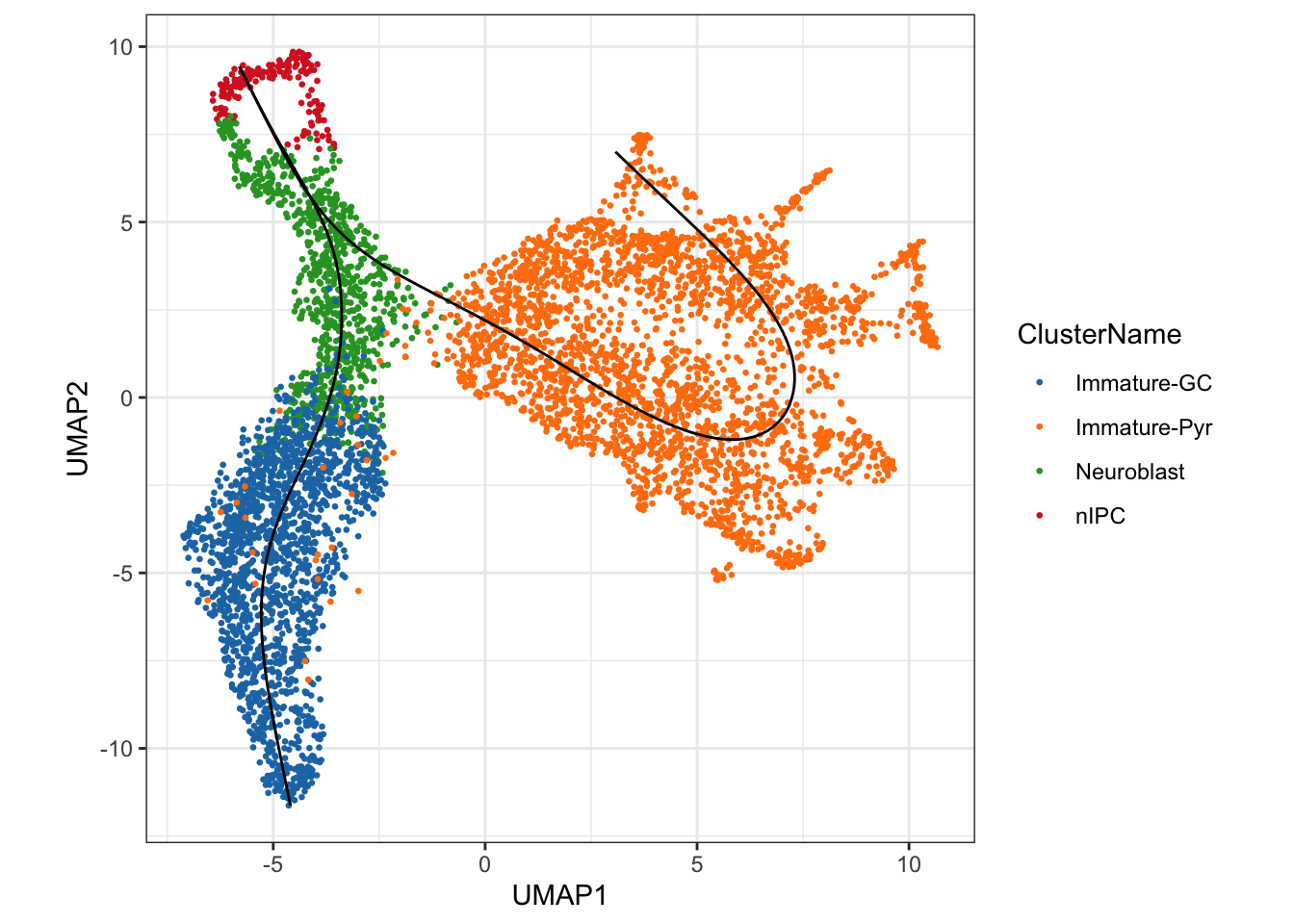 The visualisations suggests the presence of a clear trajectory. Starting from the progenitor cells (neural intermediate progenitor cells (“nIPC”), there is bifurcation of the trajectory into the two major lineages: the immature dentate gyrus granule neurons (“immature-GC”) and immature pyramidal neurons (“Immature-Pyr”).