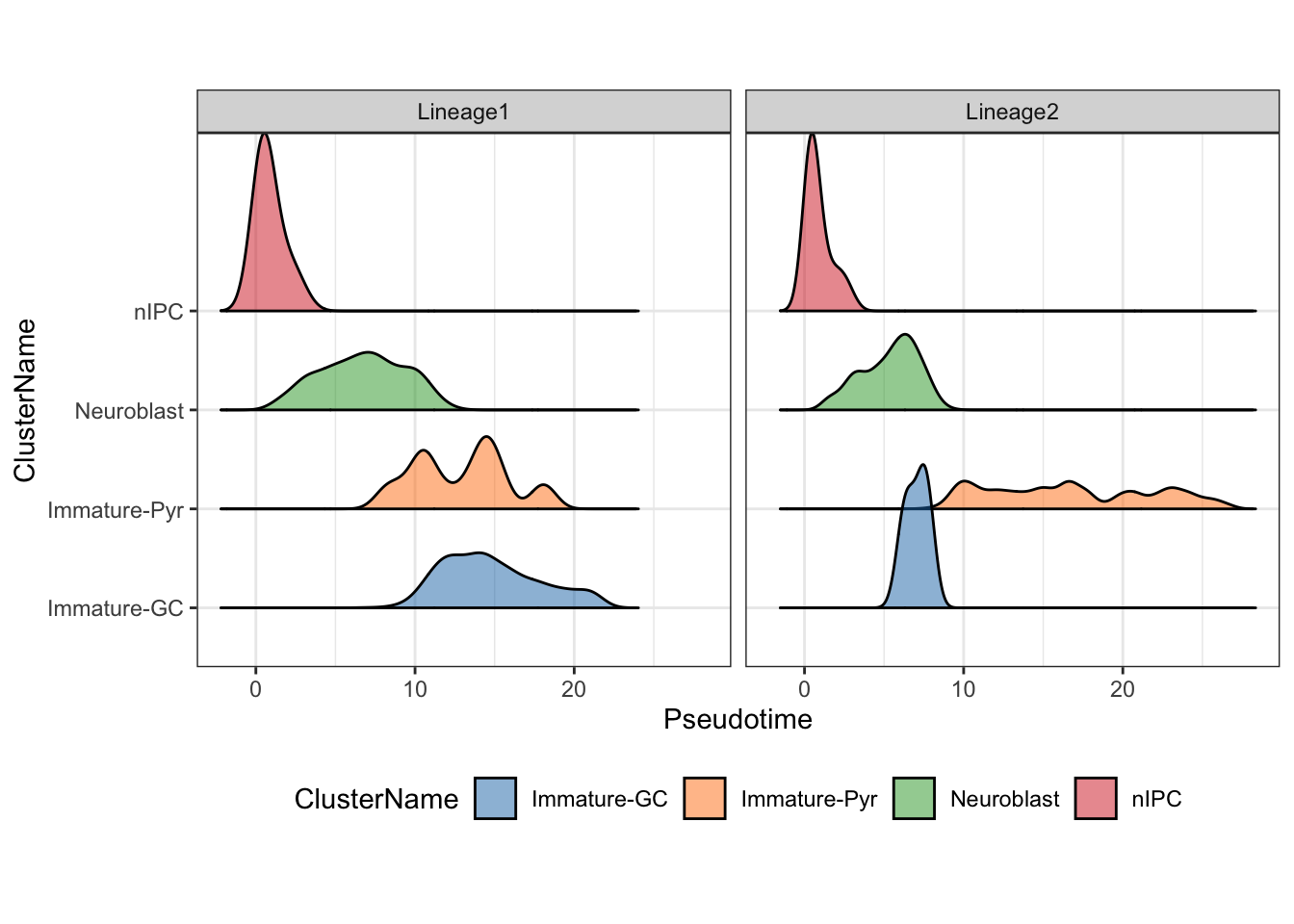 Details: Slingshot implements a two-stage procedure whereby in the first step it infers the global lineage structure using the multi-spanning tree (MST) and then infers the pseudo-time for cells along each lineage by fitting simultaneous “principal curves” across multiple lineages. When known, we can also assign the starting node/cell type (i.e., “nIPC”).