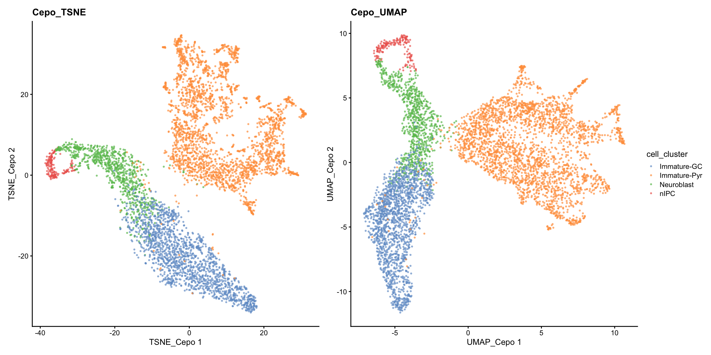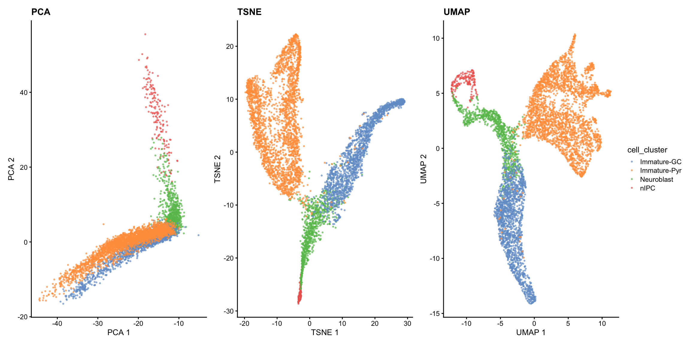 While the PCA looks similar to our previous visualisation using HVGs, we can see from the t-SNE and UMAP that there is greater refinement of the two potential subpopulations within the immature pyramidal cells.