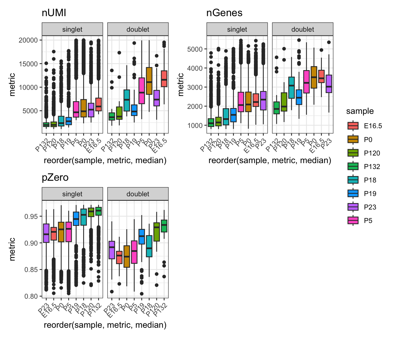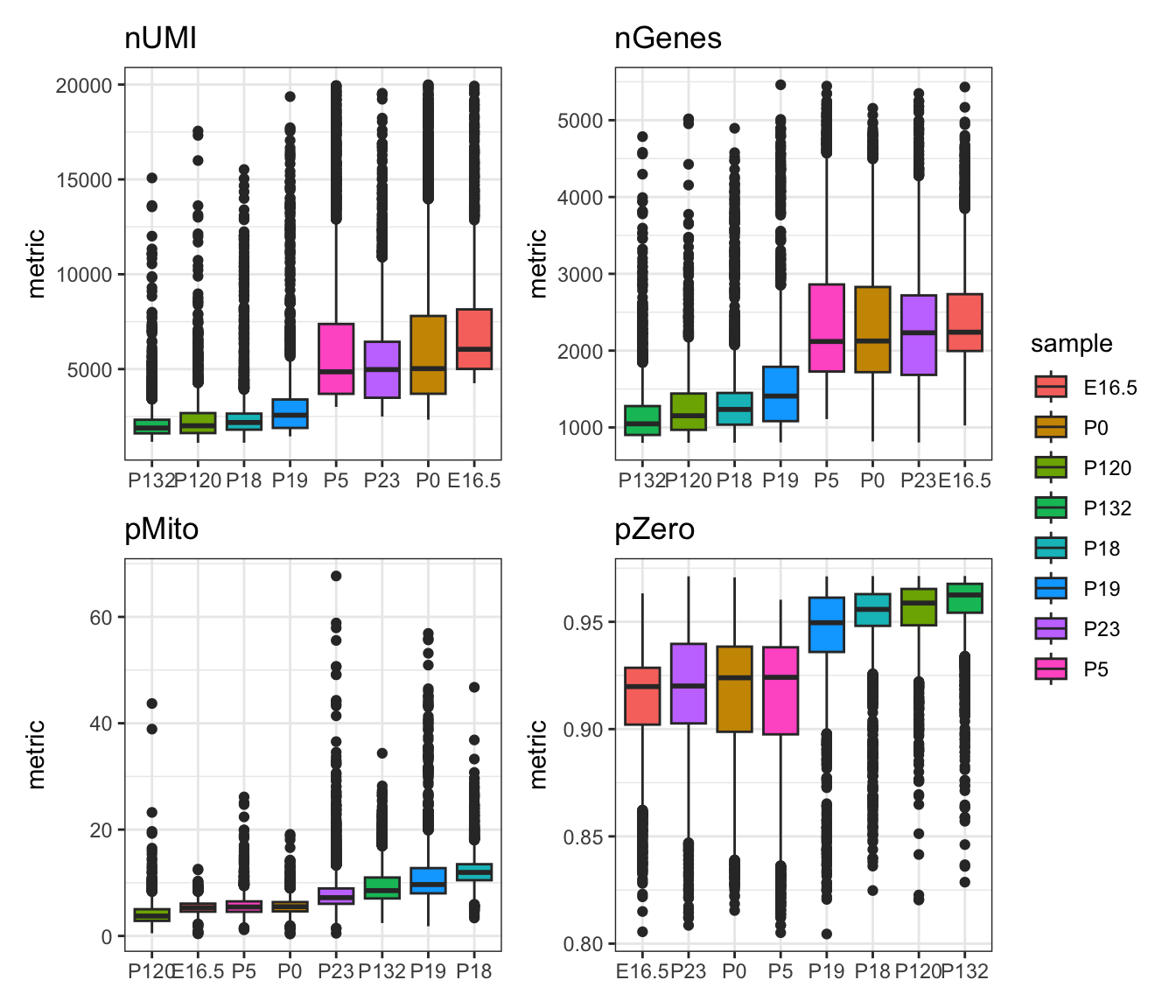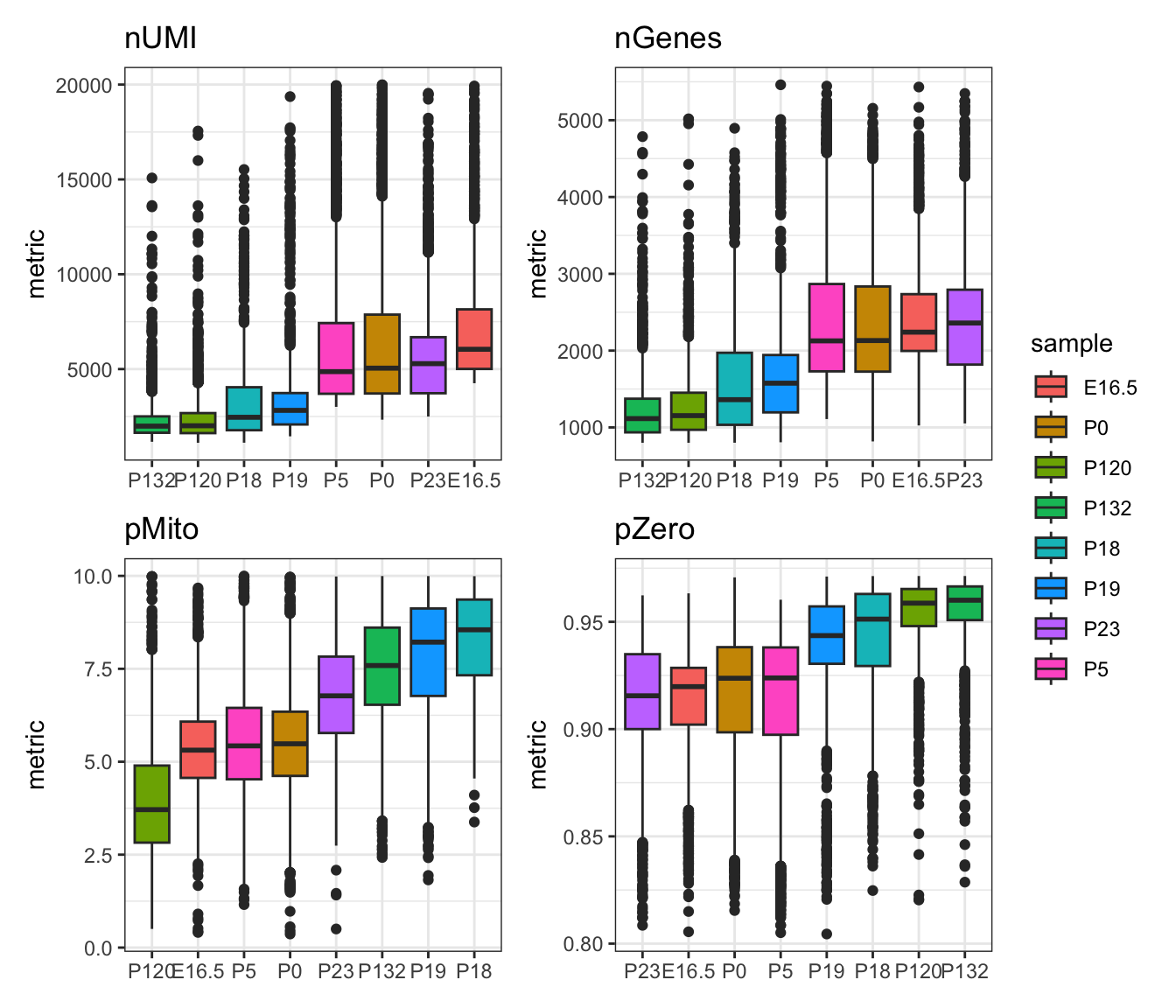 metrics <- c("nUMI", "nGenes", "pMito", "pZero", "age", "scDblFinder.class")