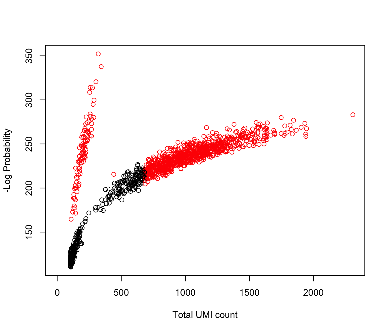 plot(e.out$Total, -e.out$LogProb, col=ifelse(is.cell, "red", "black"),