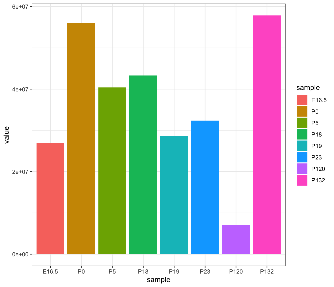 reads$sample <- factor(reads$sample, levels=c("E16.5", "P0", "P5", "P18", "P19", "P23", "P120", "P132"))