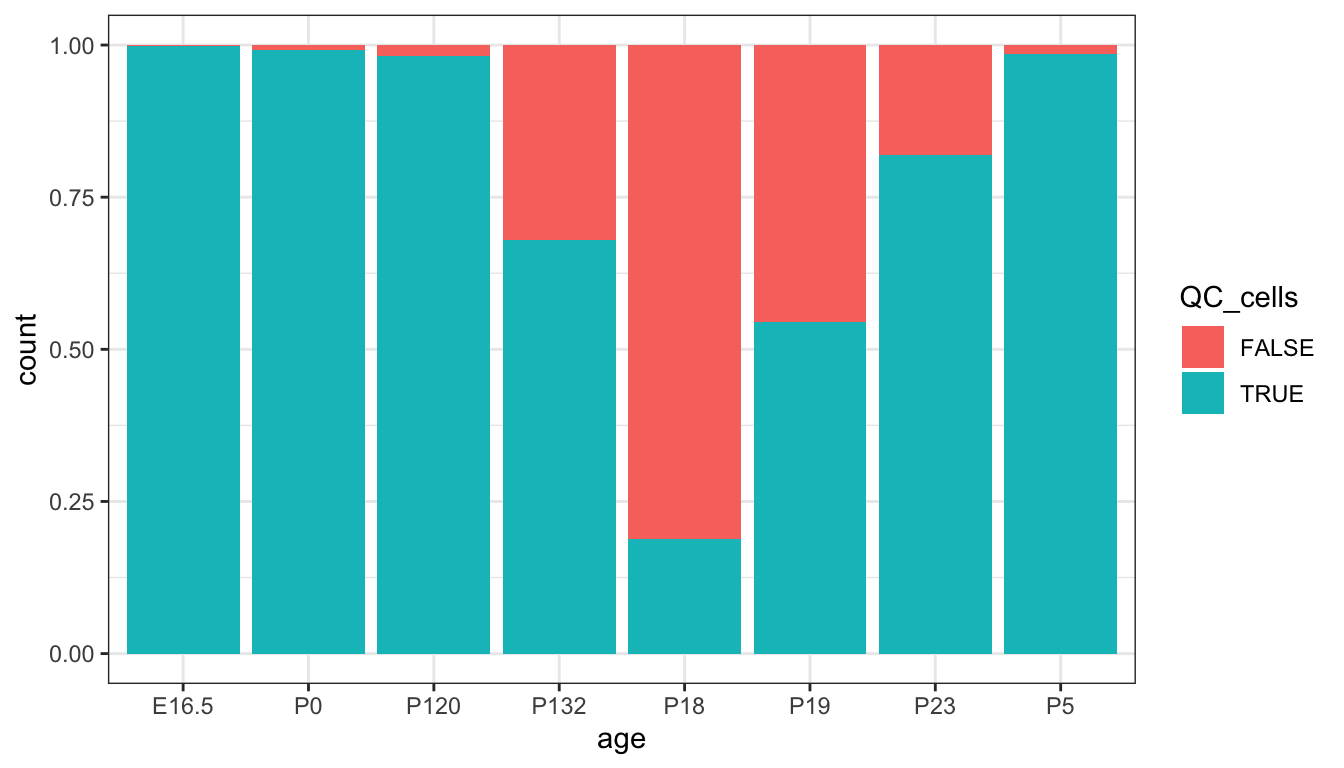 From this bar plot, we see that each age has different, particularly P120. Given the sequencing was not run in separate batches, we ideally expect the total reads to be approximately similar. Therefore, at this stage, we can potentially flag low quality cells for samples with low total reads.